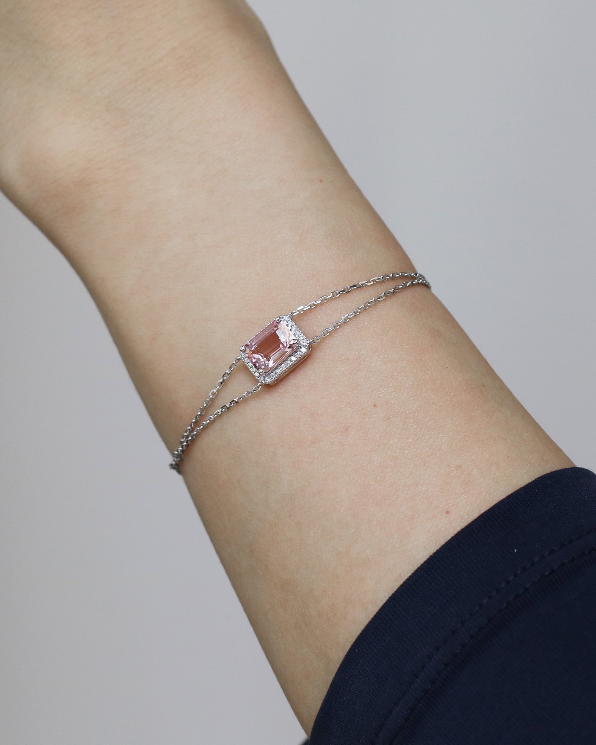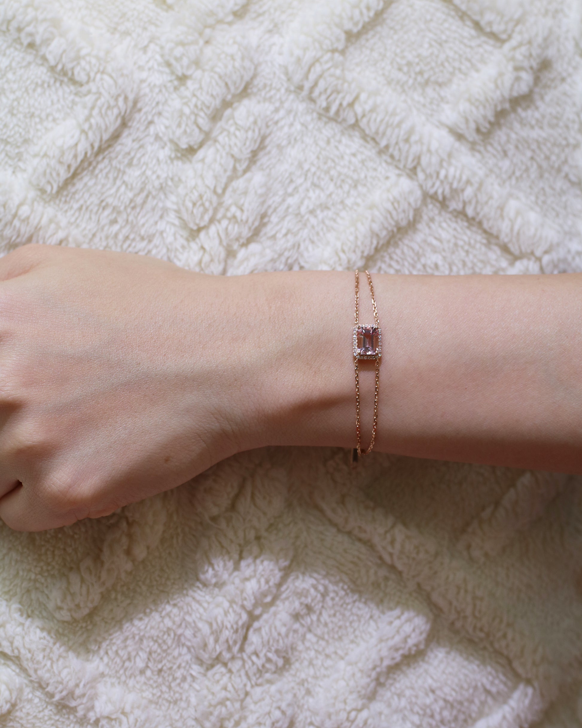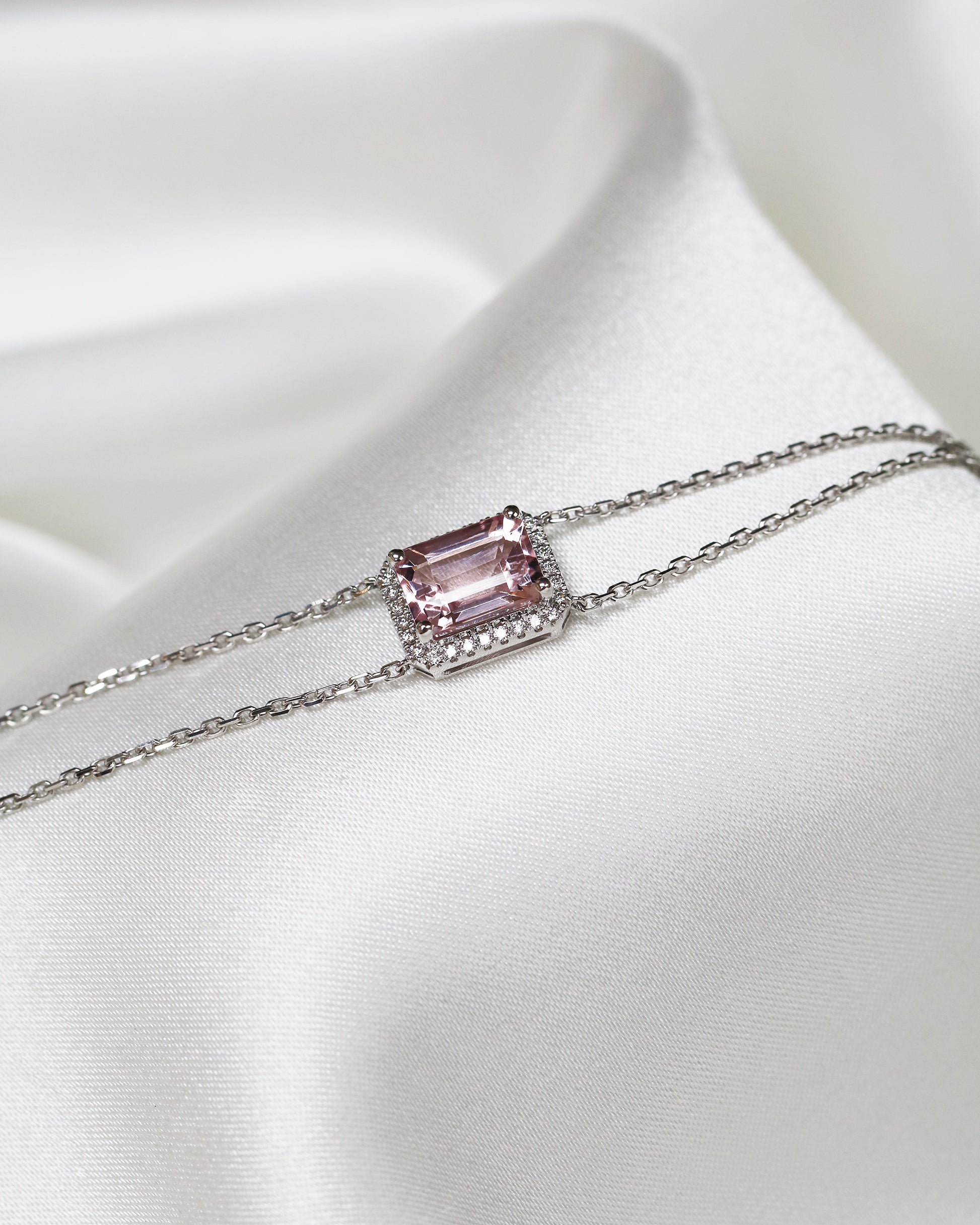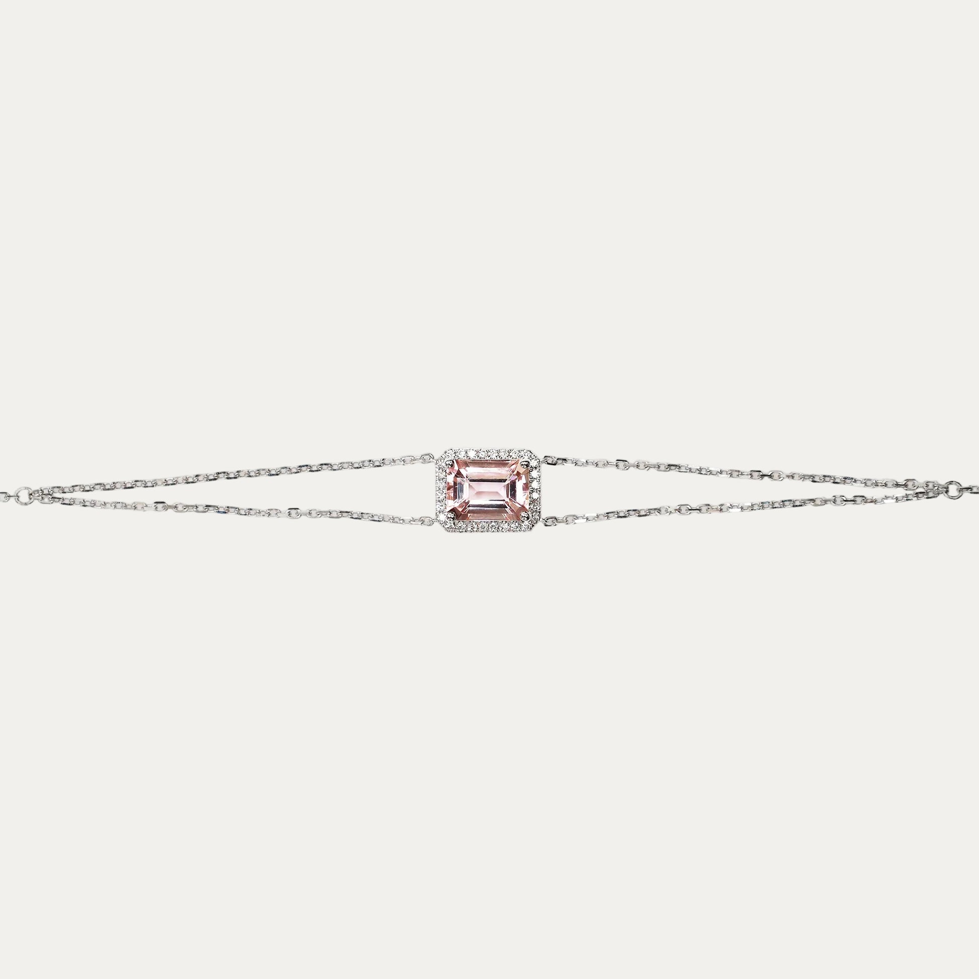 Elevate your wrist with timeless elegance. This sophisticated bracelet features a stunning emerald-cut morganite centerpiece, cradled in a luminous diamond halo that amplifies its sakura cherry blossom pink radiance. The double chain design adds refined movement and visual interest, creating a piece that transitions seamlessly from everyday luxury to special occasions. Crafted with meticulous attention to detail, this bracelet embodies understated glamour and enduring beauty.