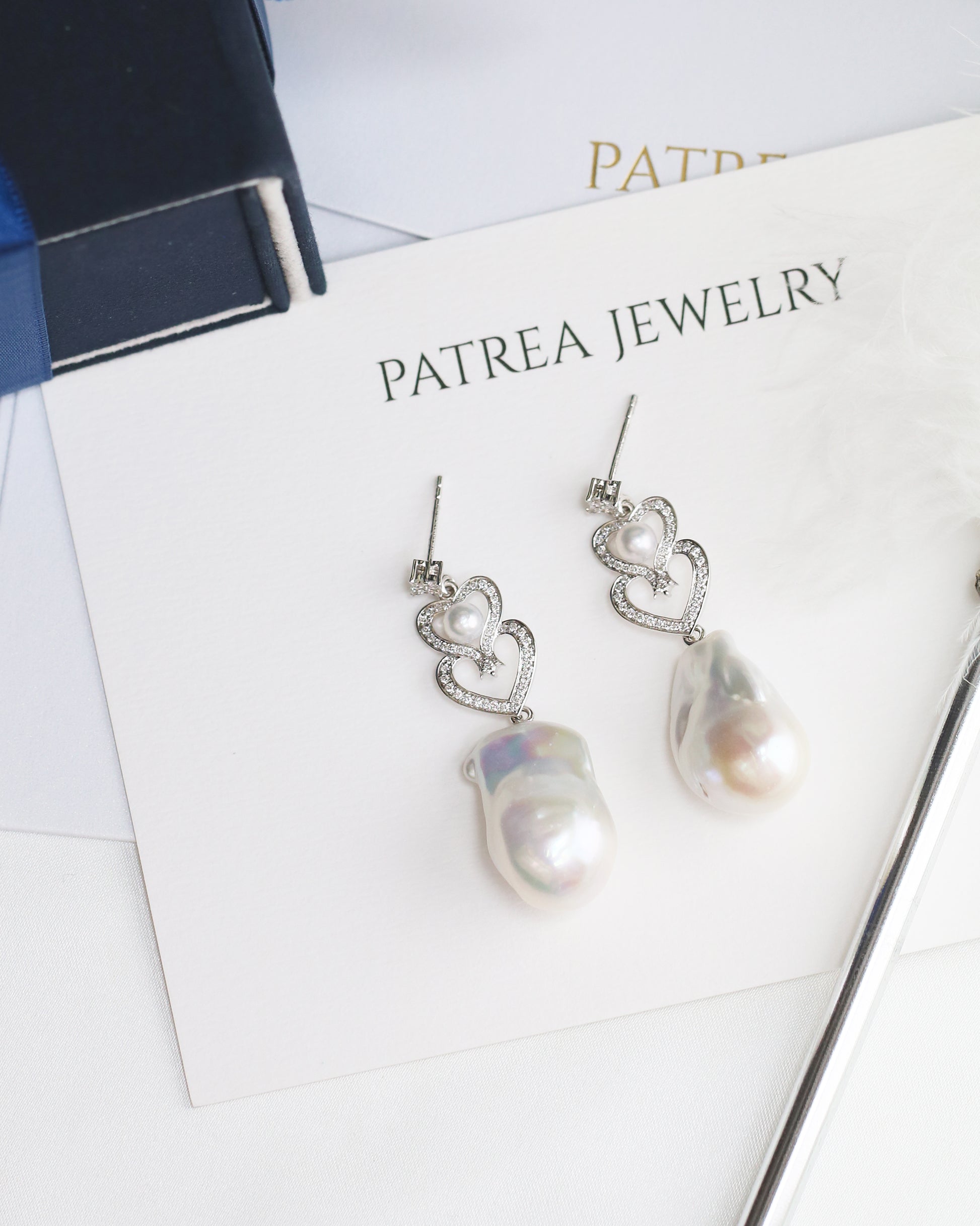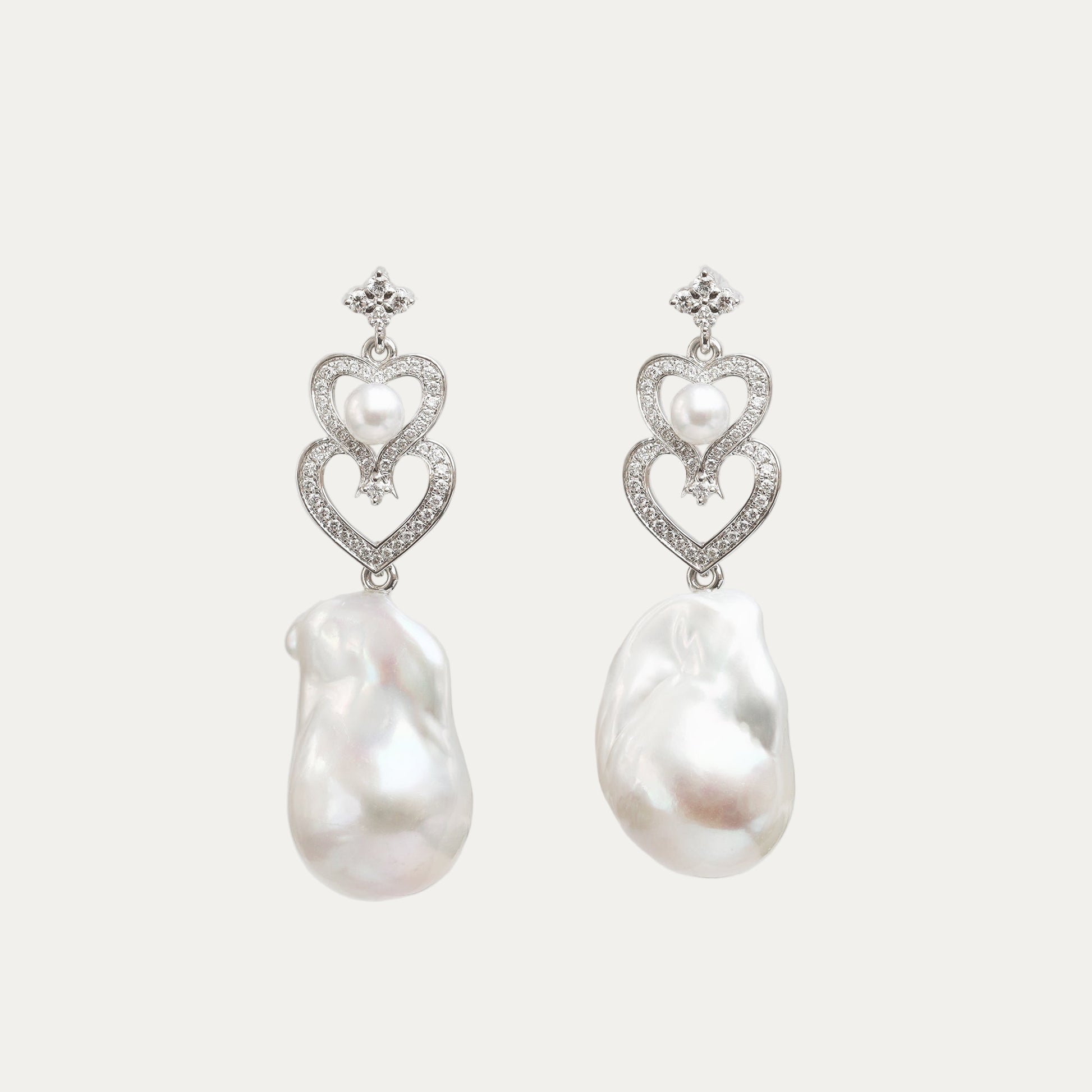 18K白金心形鑽石 × 巴洛克珍珠中長款耳環