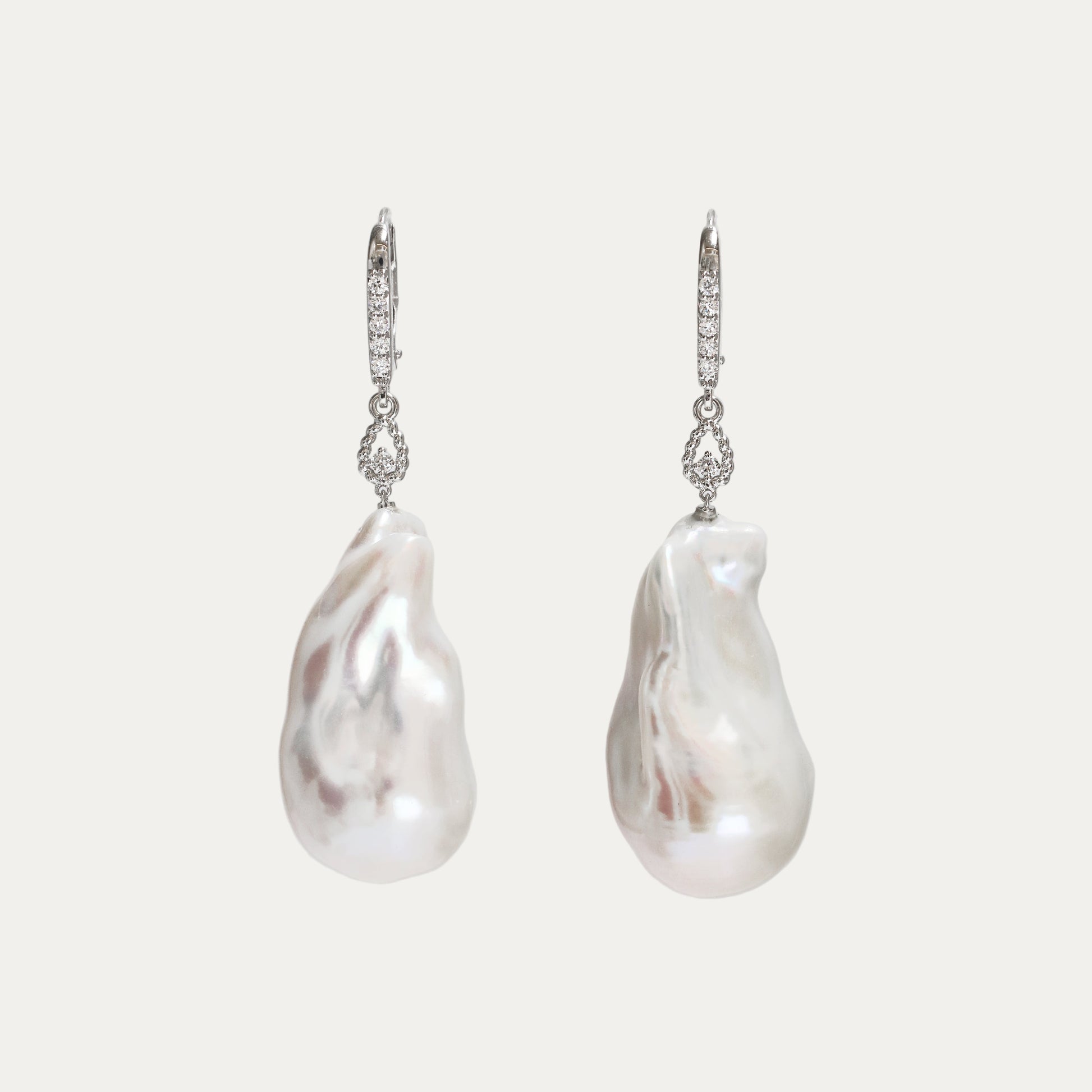18k White Gold Baroque Pearl Diamond Dangle Earrings
