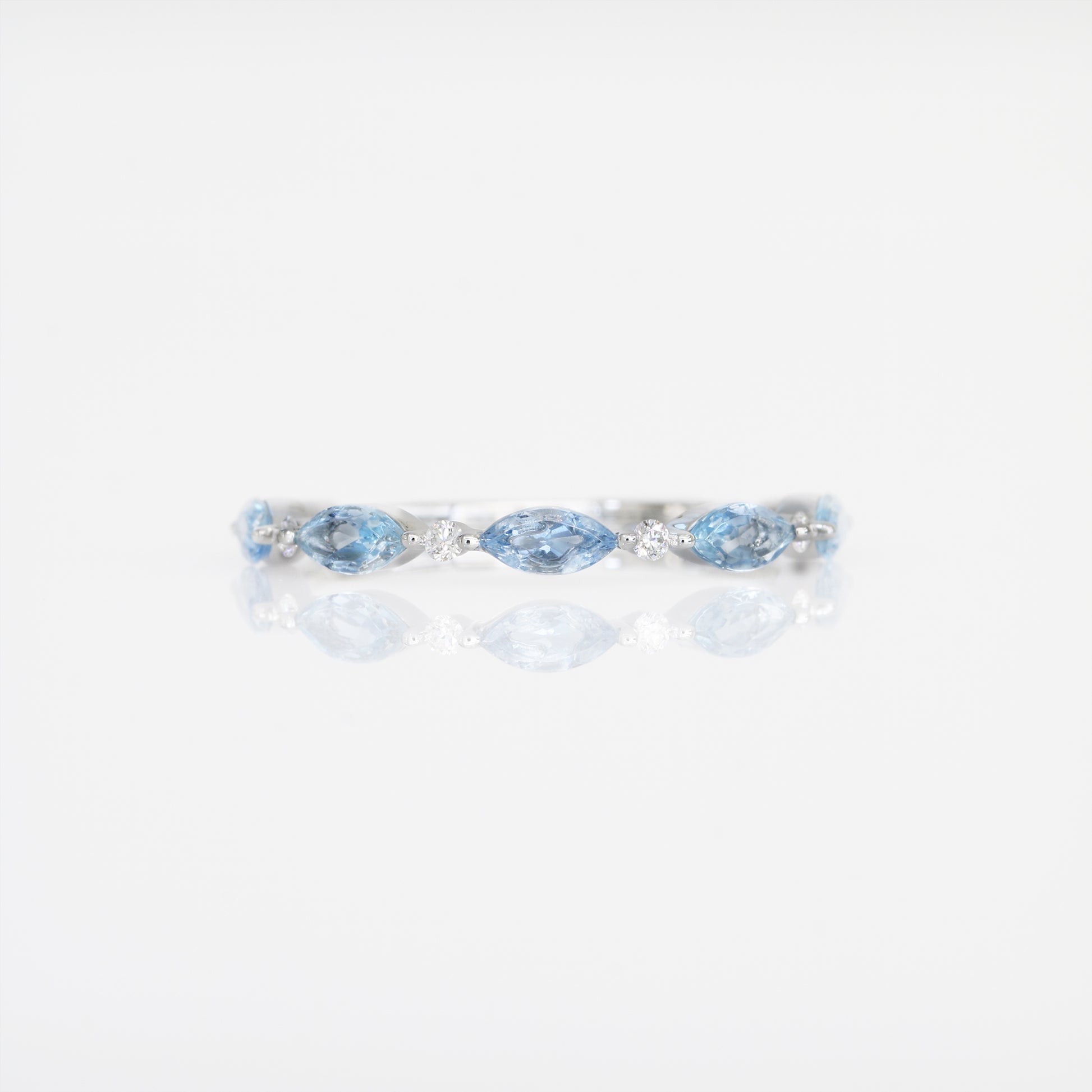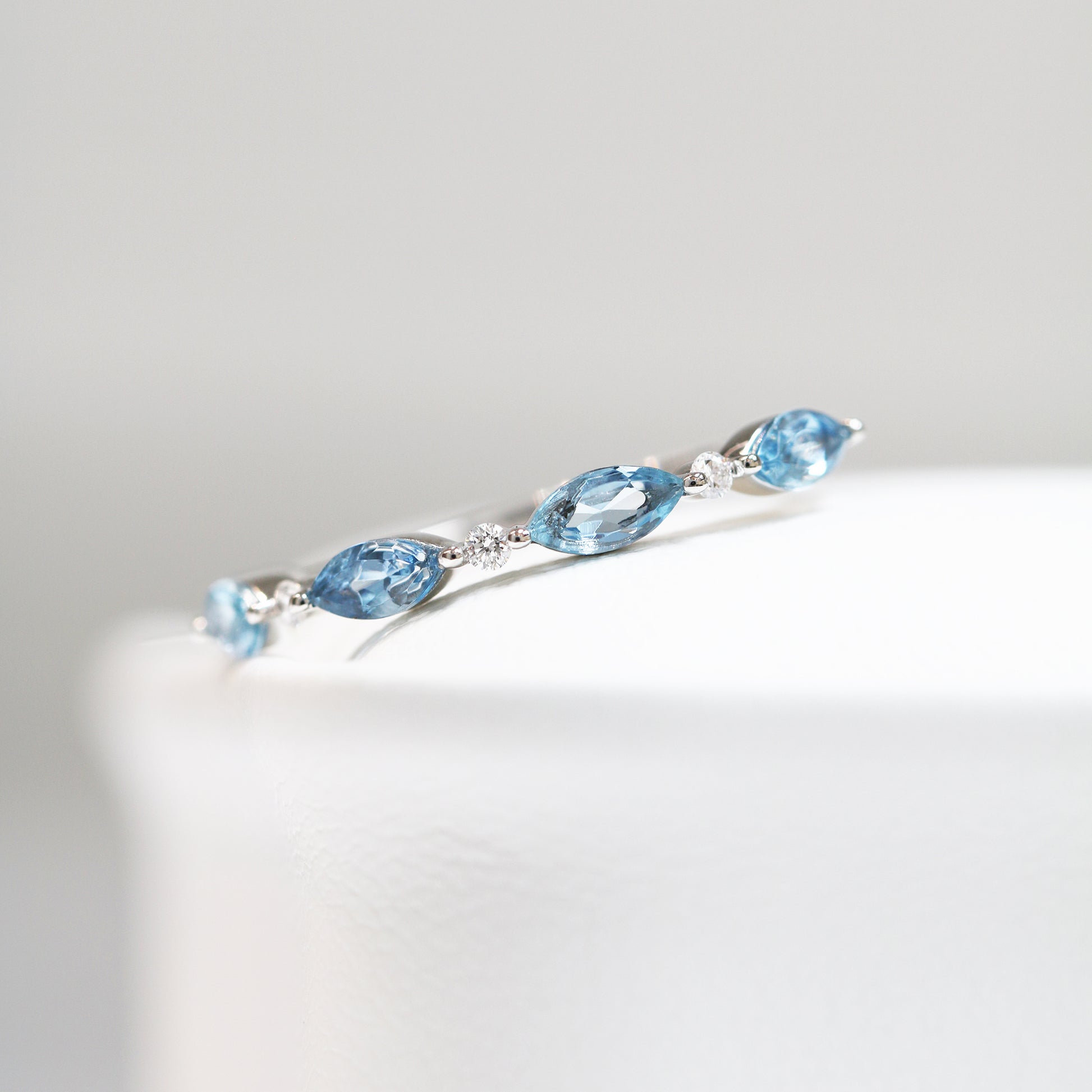 一次採購聖瑪利亞海藍寶海藍寶時,偶然找到這種很深而細小的欖尖形。剛好那陣子為客人做了隻很好看的欖尖形求婚戒,想到不如用這形狀做線戒,幼細長長的欖尖形海藍寶配上小鑽精緻特別,希望大家喜歡。