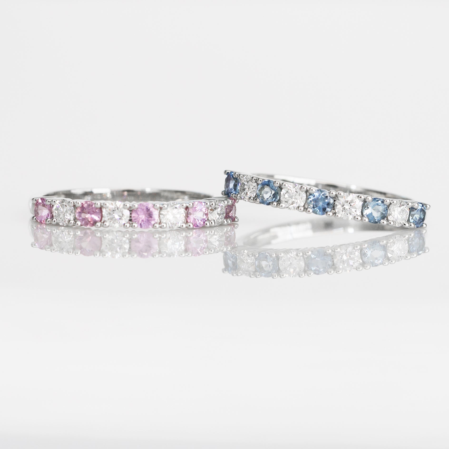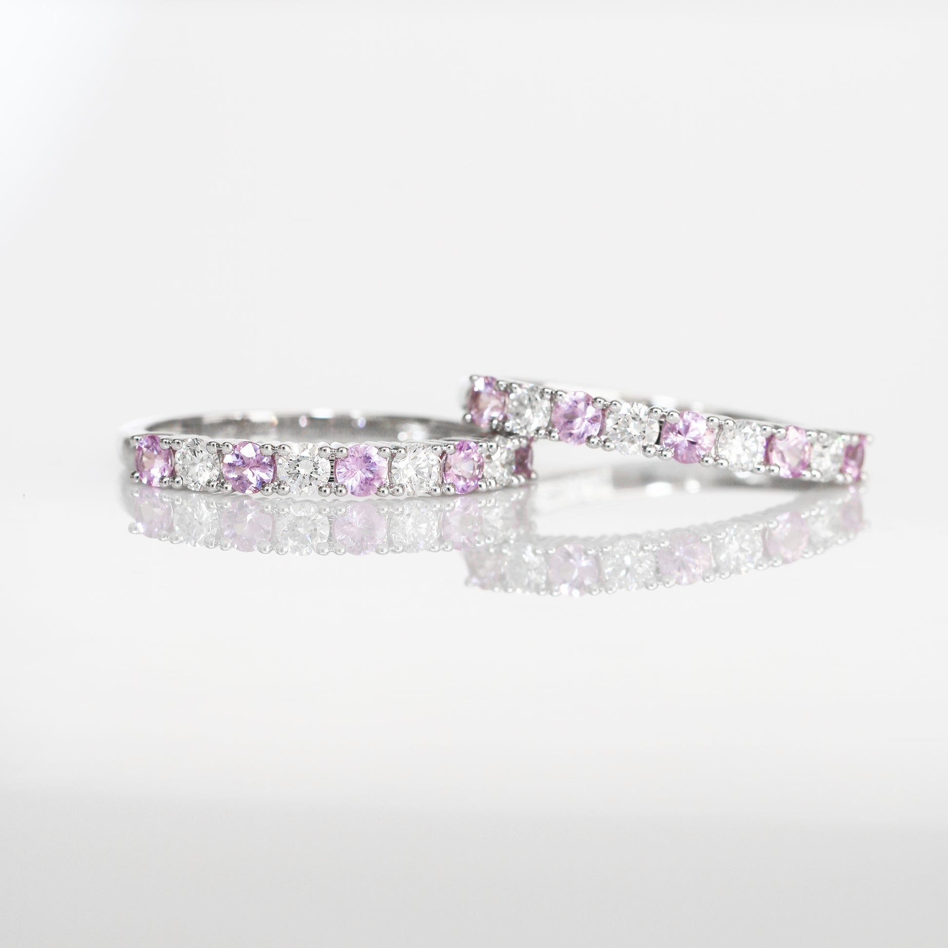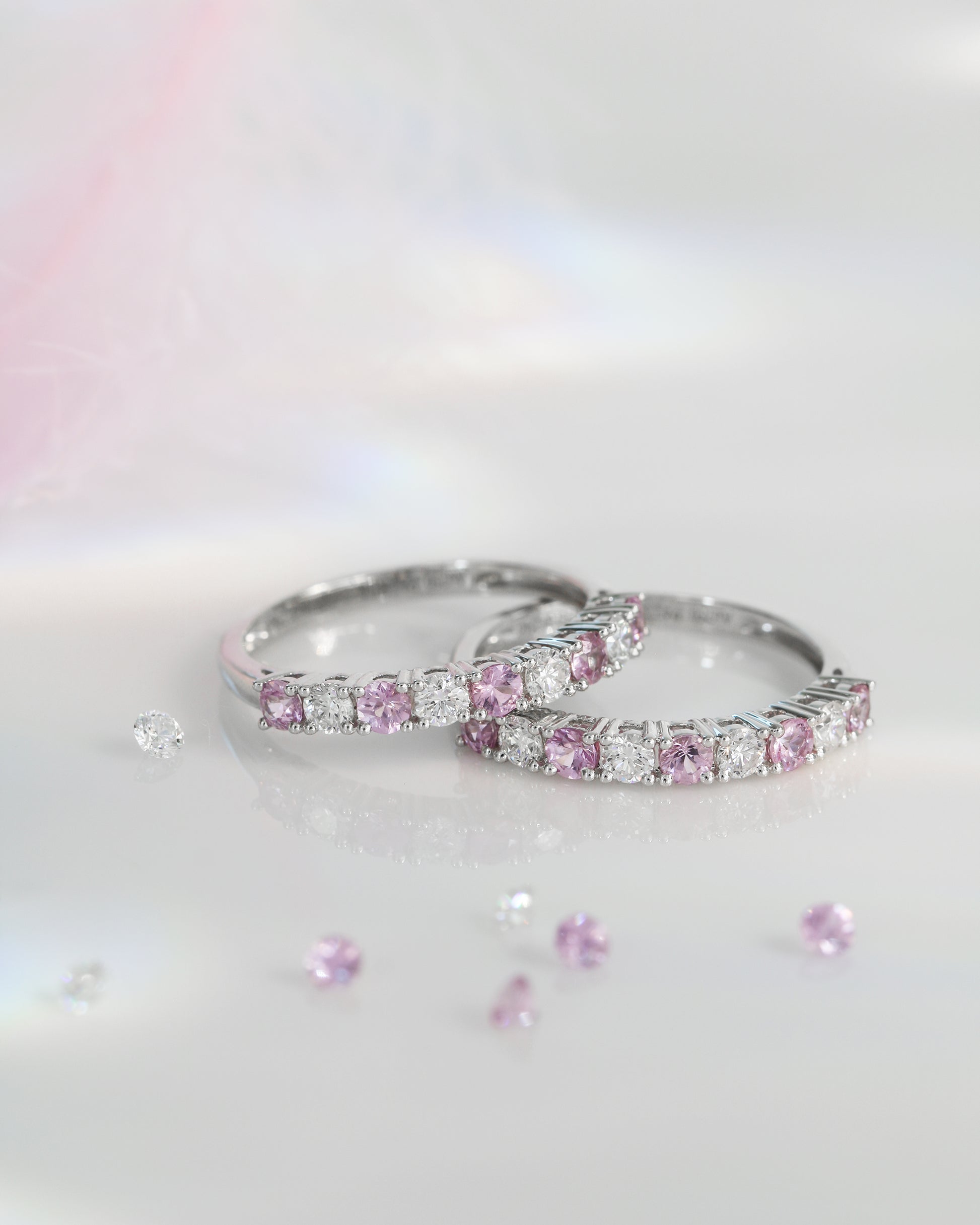 以18k白金點綴,簡單俐落的四爪設計,每顆粉紅藍寶石與天然鑽石輪流交錯,精巧細緻。與一般常見的粉色藍寶石不一樣,配色特別粉嫩柔和,仿如天然粉鑽的淡雅色澤,展現溫柔氣質。
