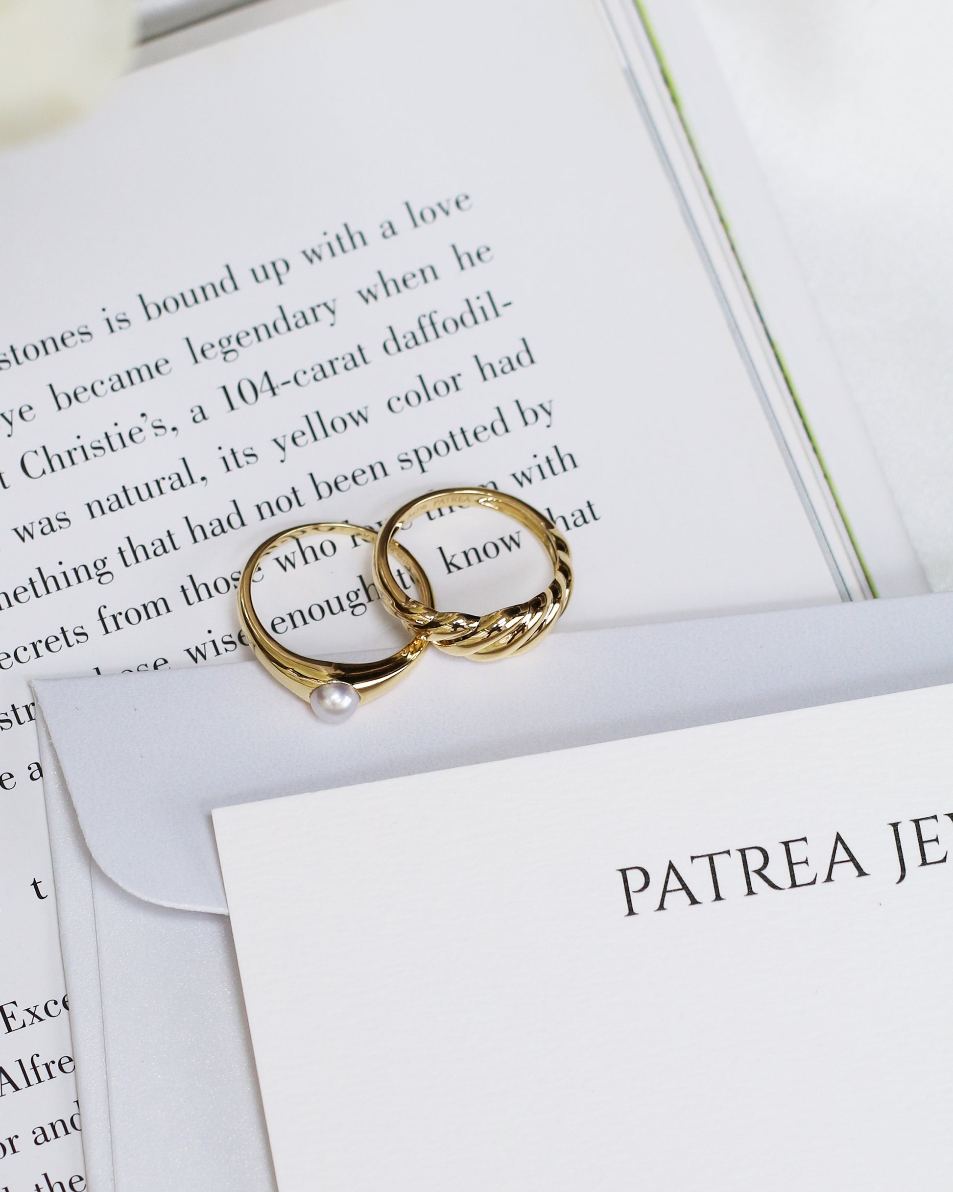 戒身以簡約漸粗線條呈現立體弧度,主石位置鑲嵌一顆皮光透白的日本 Akoya 珍珠。18K 黃金的暖色調更襯托珍珠的純白光澤,優雅低調,適合作為每天佩戴的小戒指。