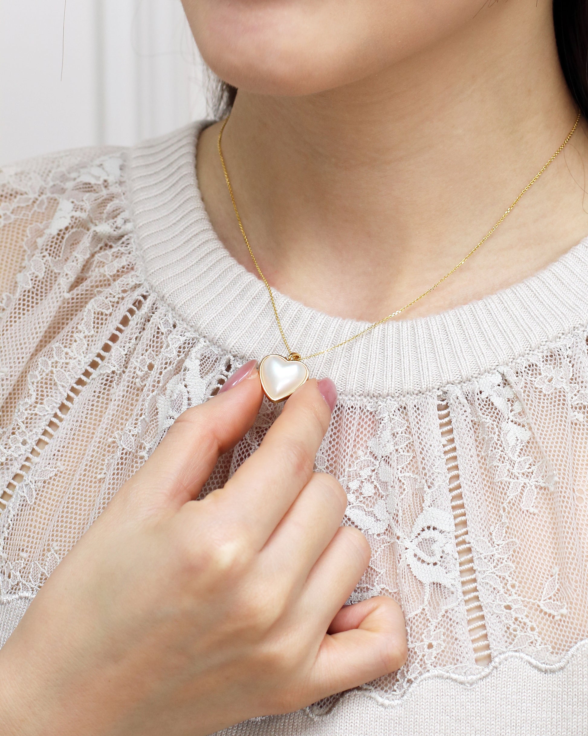 心形象徵浪漫、圓滿與永恆,罕見的心形珍珠母貝搭配18K黃金加厚包邊,第二次改版的吊墜增添飽滿質感與立體度。正反兩面不同的金屬與母貝珍珠紋理設計,提高辨識度。
