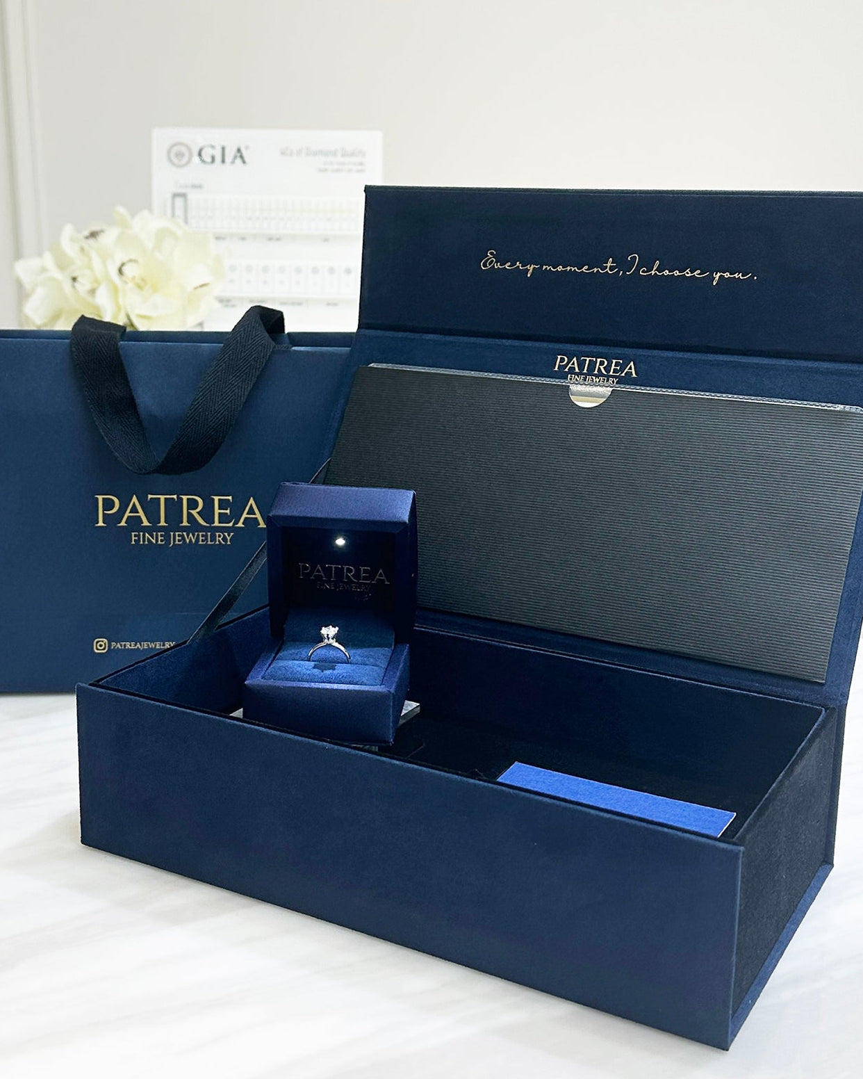 The thoughtfully designed outer box includes an extra compartment specifically for the GIA certificate, keeping everything precious in one elegant package. Plus, enjoy a special surprise from us when you collect the ring!