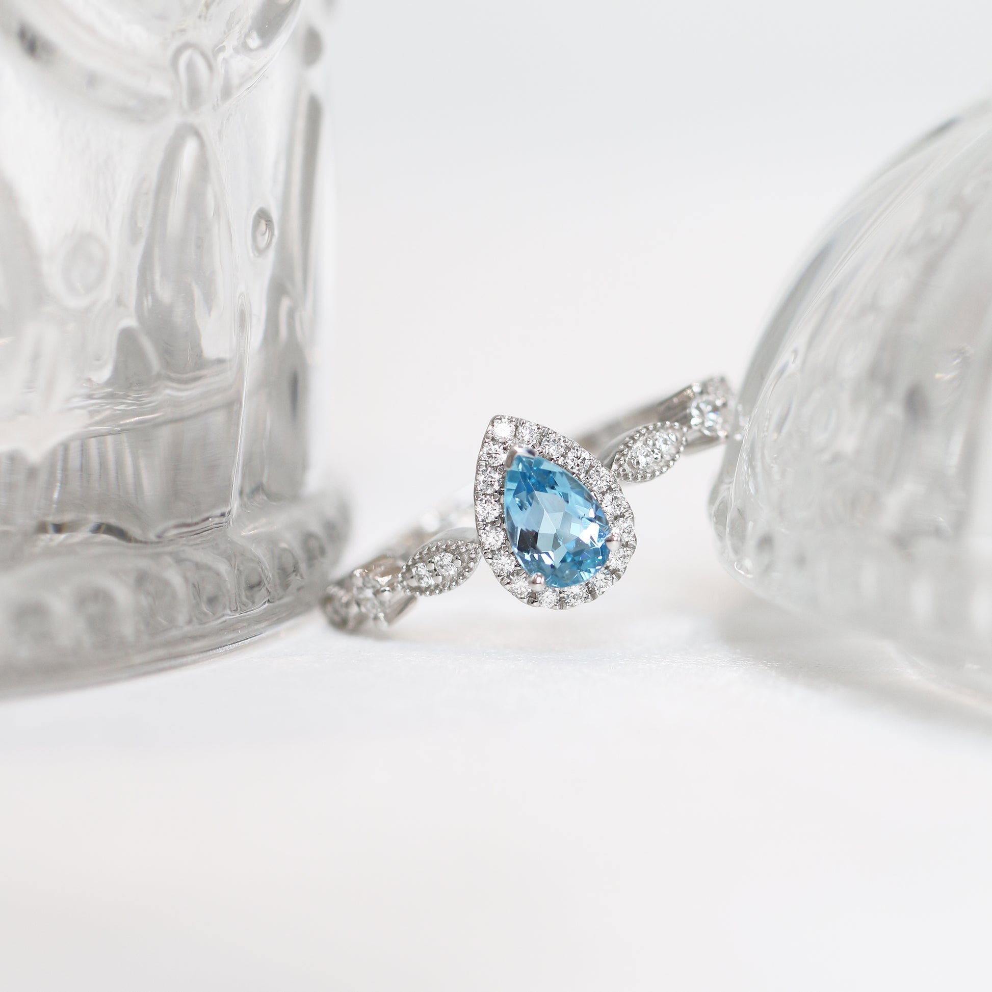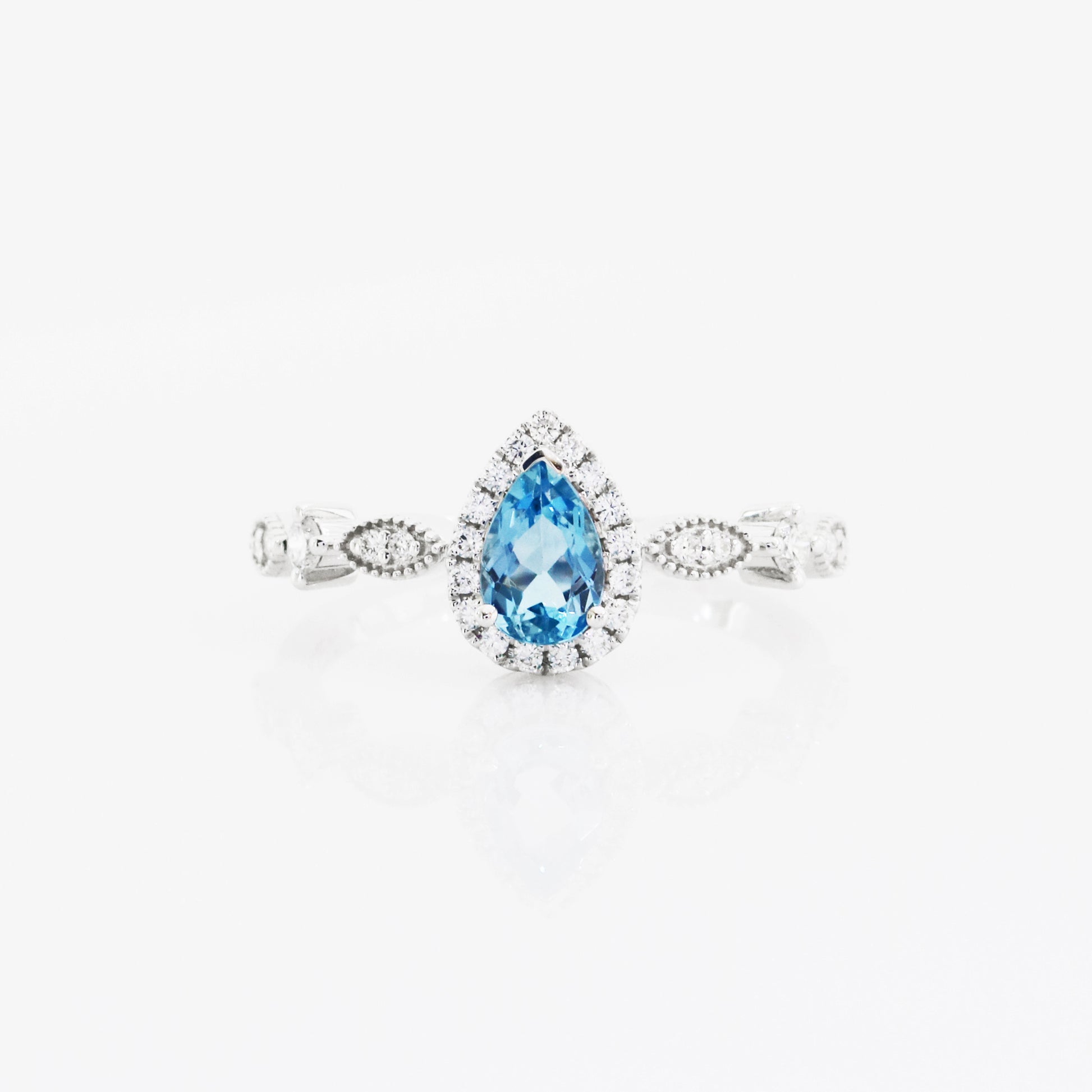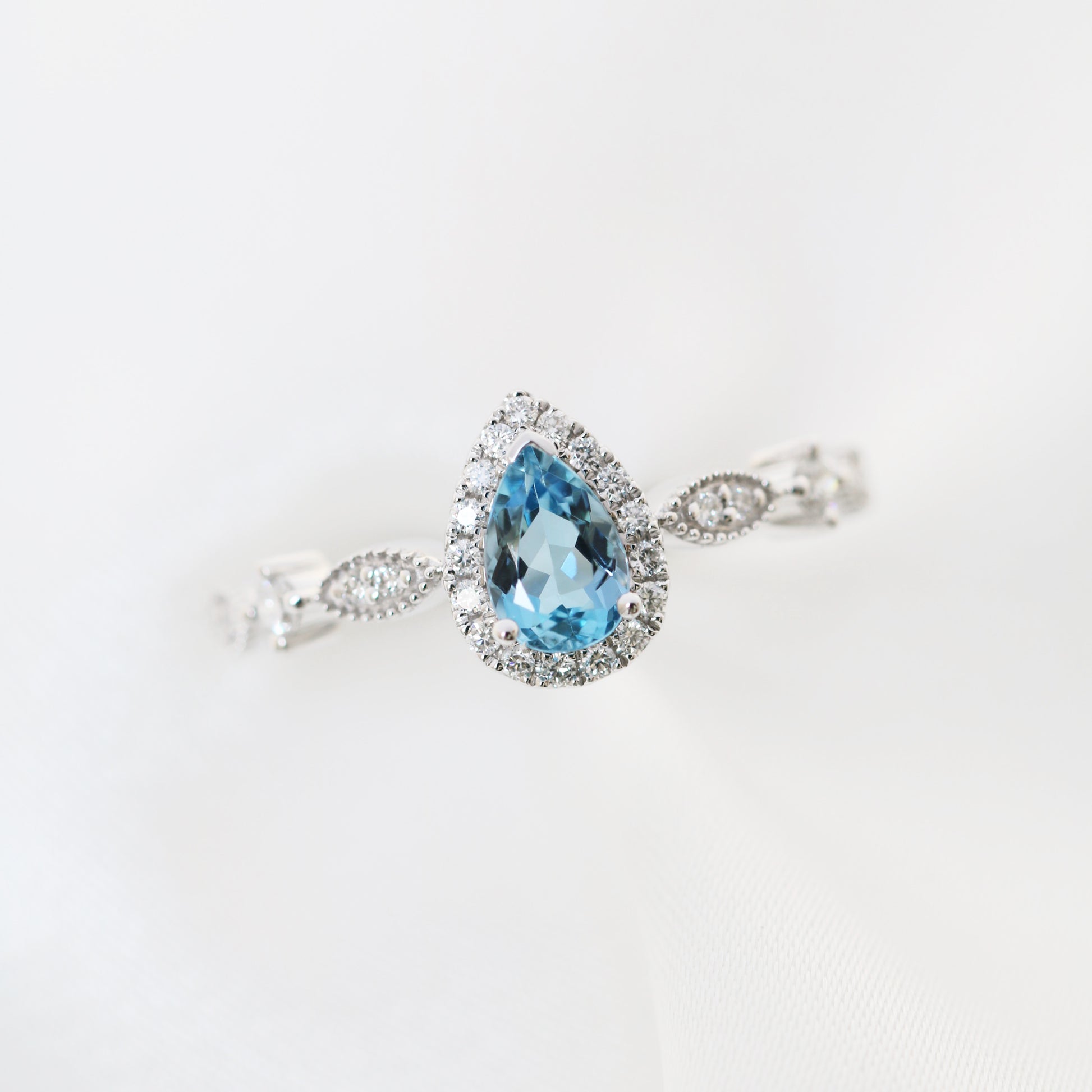 Jennifer戒指是我們較少有的浪漫古典風格。戒臂使用復古的滾珠邊工藝,配合馬眼形設計,使戒指更具精緻感。主石是能配搭任何膚色的湛藍聖瑪利亞海藍寶,加上大量配鑽圍繞,添上一份華麗感覺,尤其適合在特別的日子配戴。