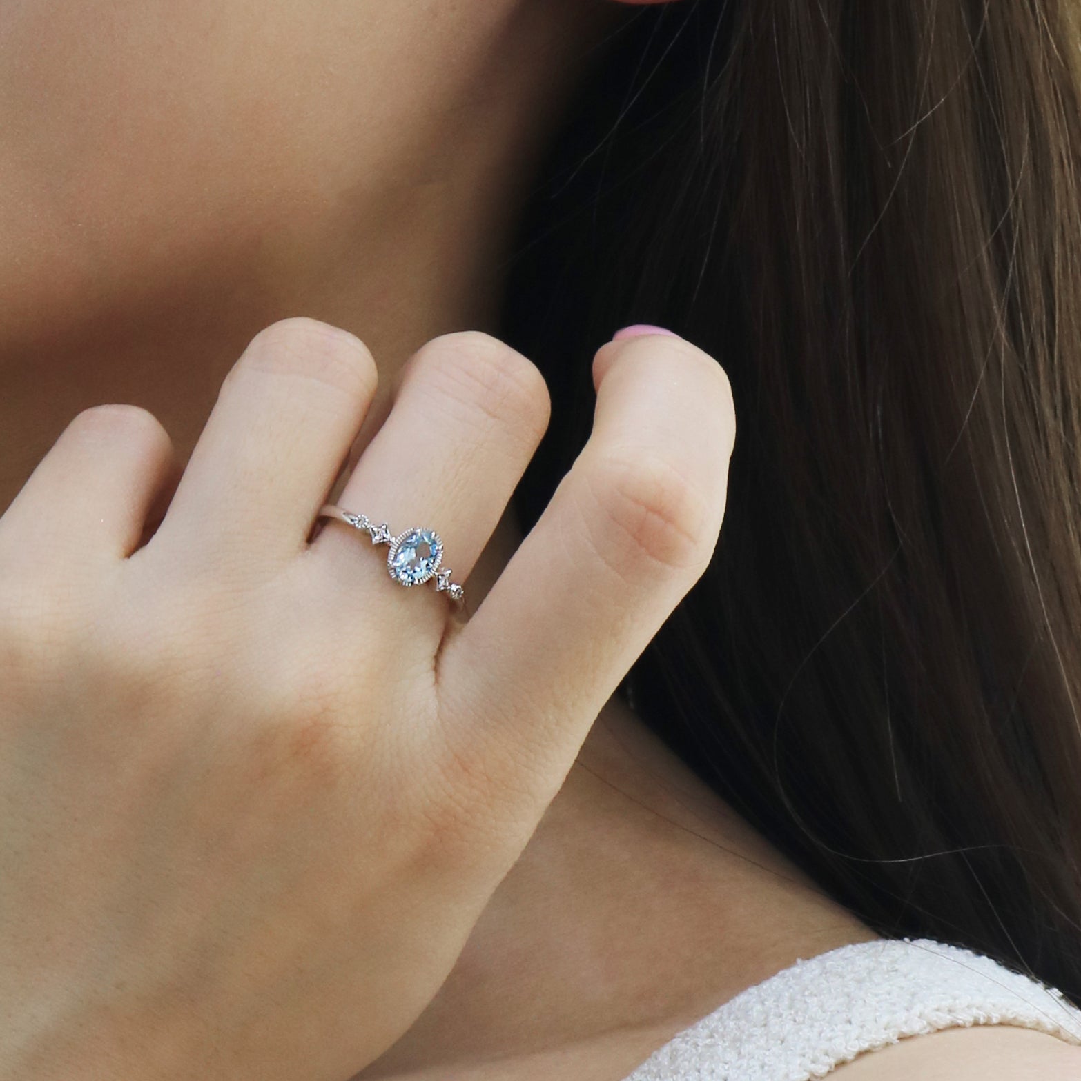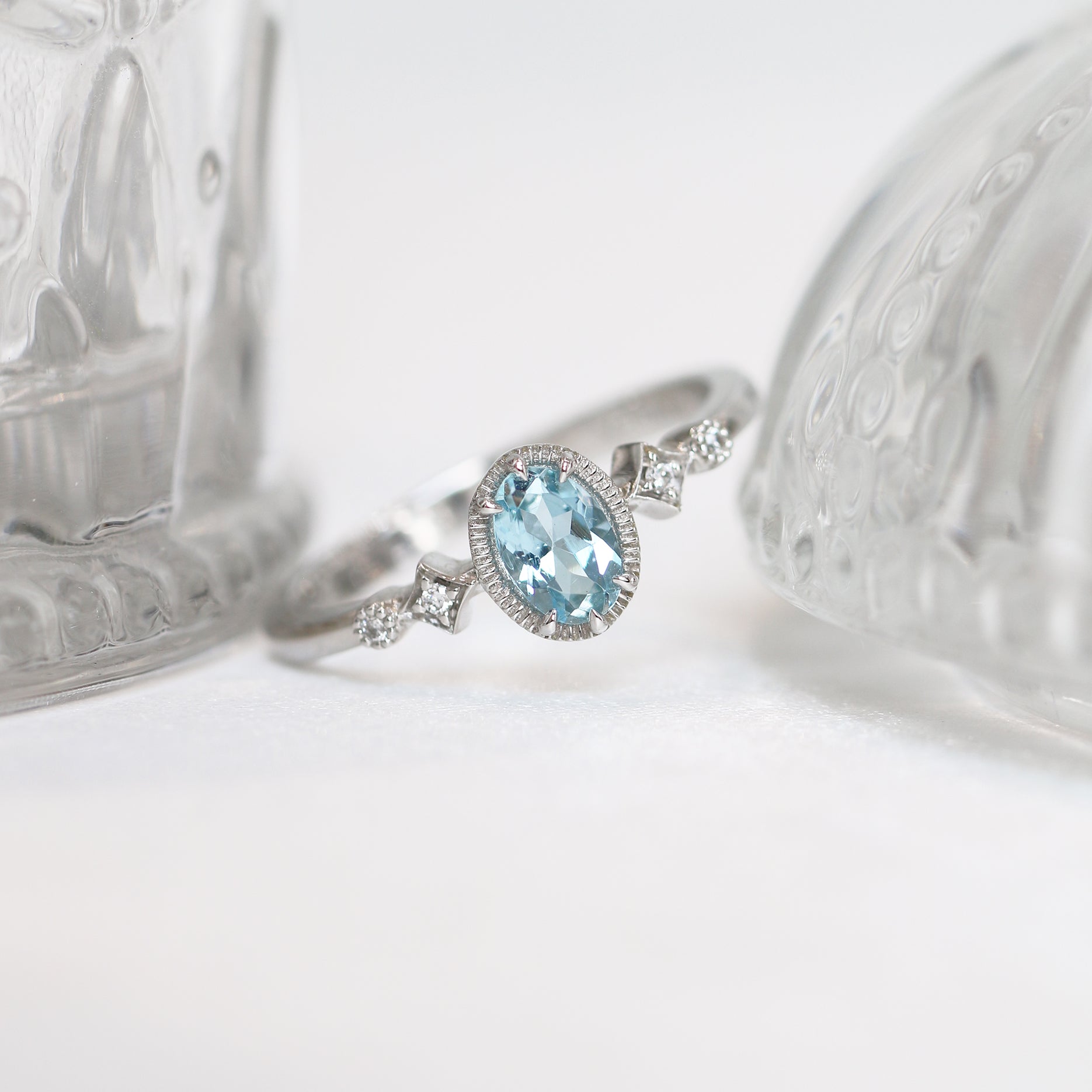 Judith的主石配以批花鑲嵌,以瓜子爪鑲嵌主石,配合似四葉爪鑲菱形和珠邊鑲,設計細膩,與別不同。戴上這隻海藍寶石戒指,頓時賦予指尖優雅魅力。