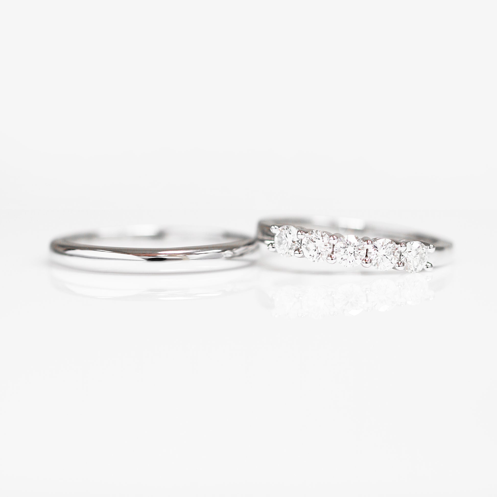 這款對戒以簡約設計為主,展現純粹愛意的永恆象徵。男戒為光身設計,內圈低調鑲嵌一顆小圓鑽,象徵男士深藏心底、恆久不變的愛。女戒則為五顆明亮式切割圓鑽組成的半圈永恆戒指,配戴時尤其舒適。鑽石切工精緻對稱,綻放耀眼火彩,特別適合喜愛鑽石閃耀光芒的女性,傳遞真摯而堅定的情感。