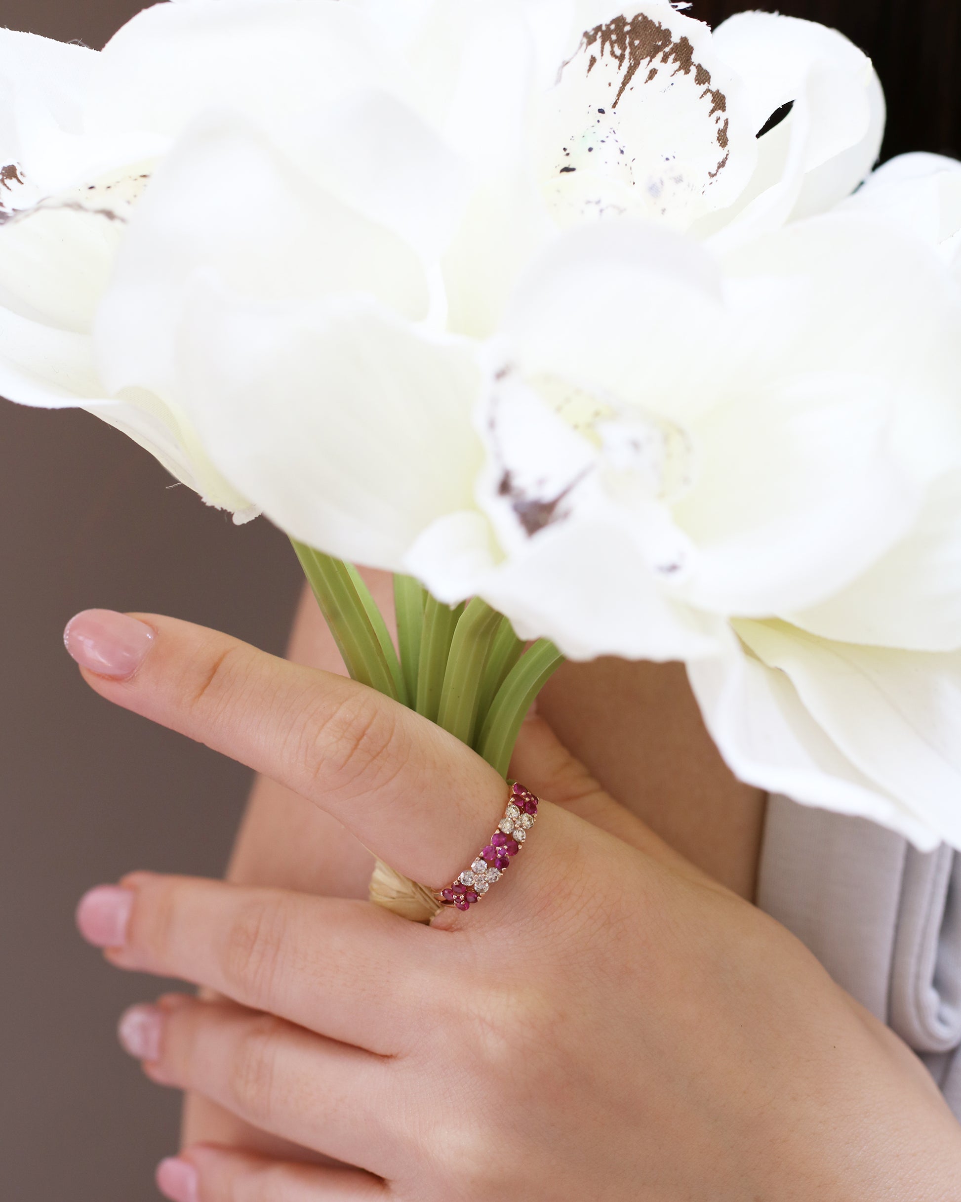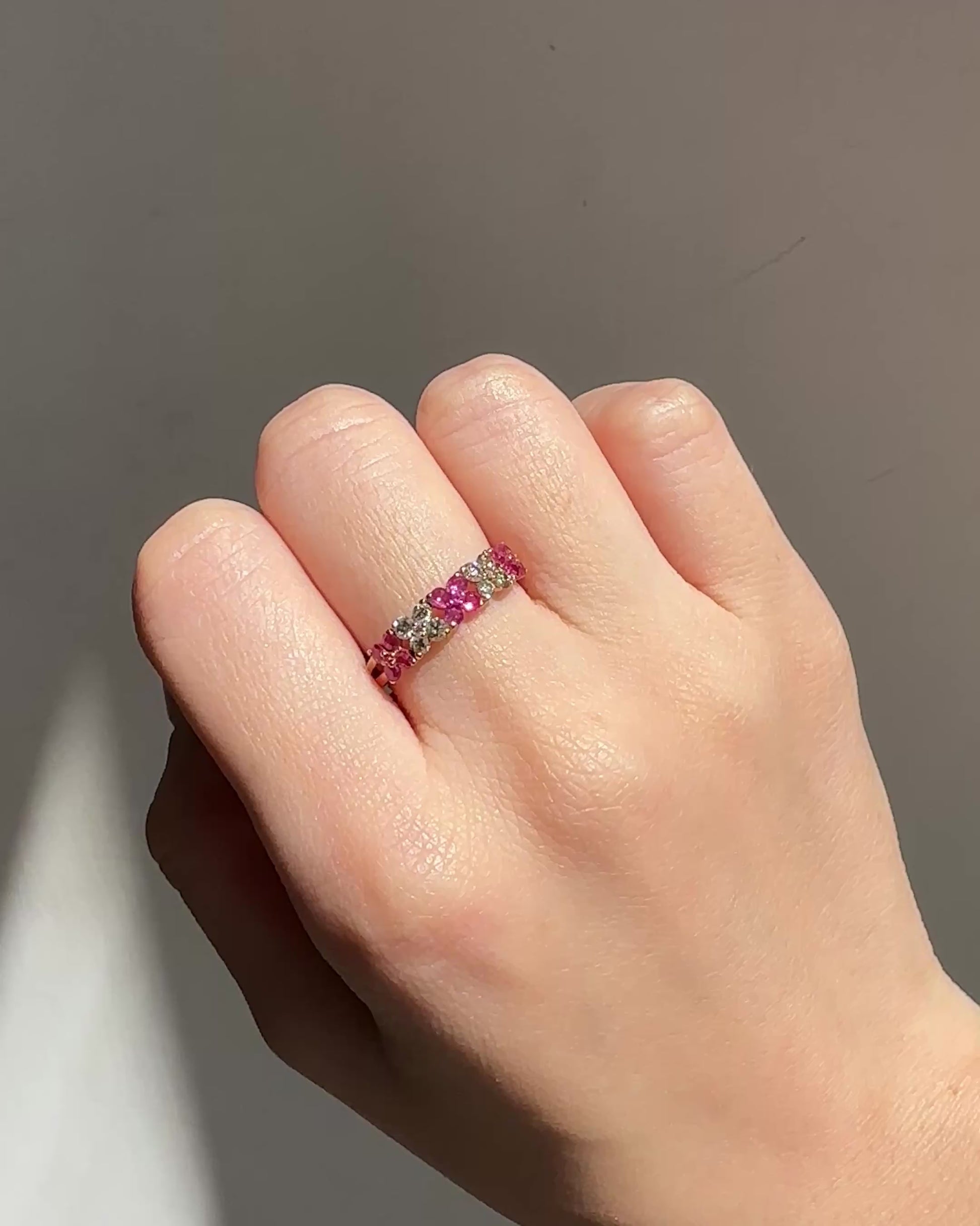 四瓣花形的粉紅色藍寶石感覺甜美,四顆粉紅色藍寶石與四顆天然鑽石輪流交錯,以花形設計排列,並以18k玫瑰金屬點綴,各自散發誘人目光。單戴一隻,即可有動人的光彩。