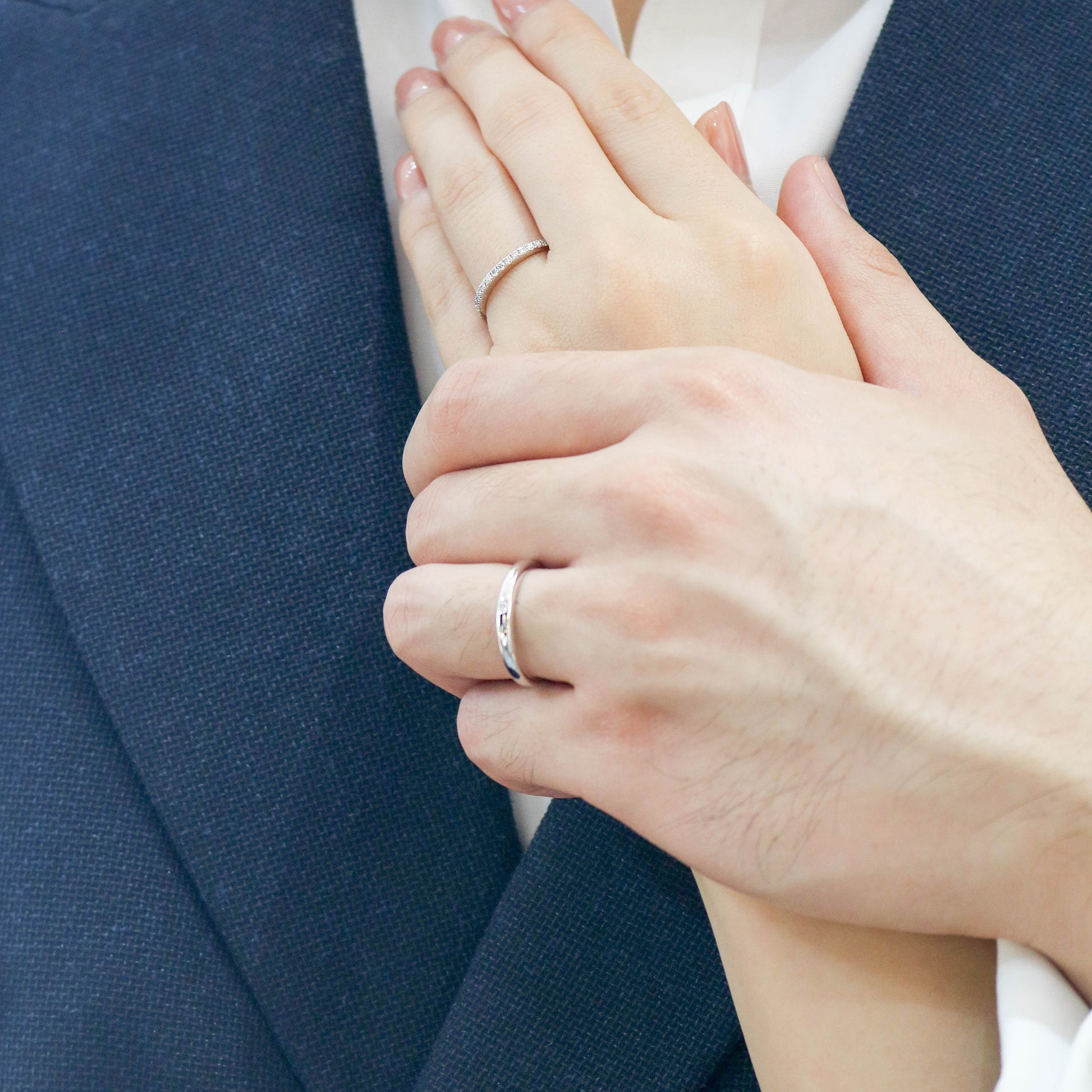 結婚戒指款式中清簡設計的一對,光身的男戒戒臂內圈鑲有一顆小圓鑽,寓意男士的愛意含蓄低調,真愛恆久不變。女戒為永恆戒指,切割嚴謹對稱的明亮式切割圓鑽,展現閃亮完美花彩,適合坦誠理性的女性,展現真摯誠懇的愛意。