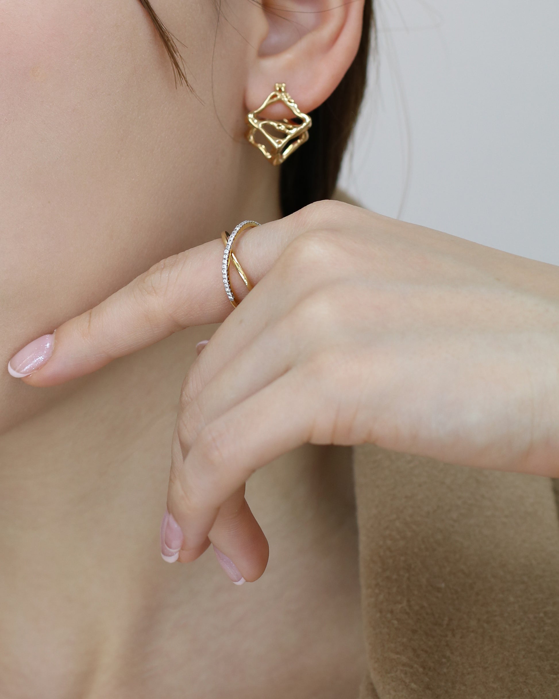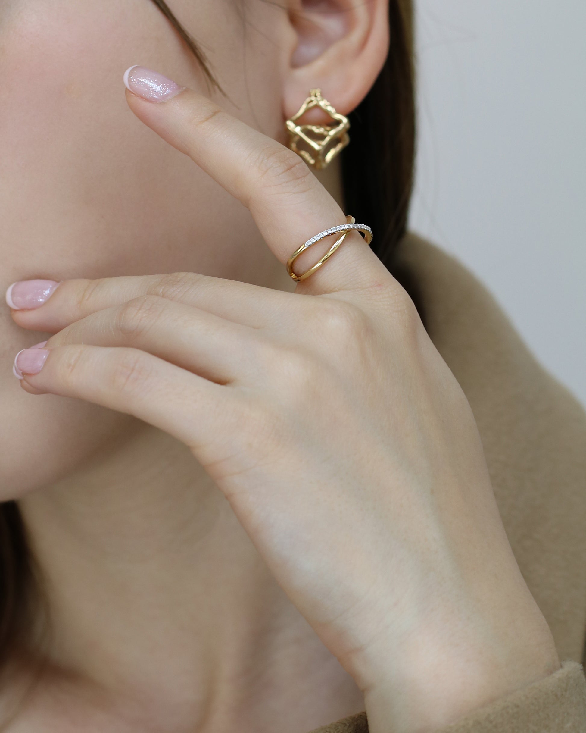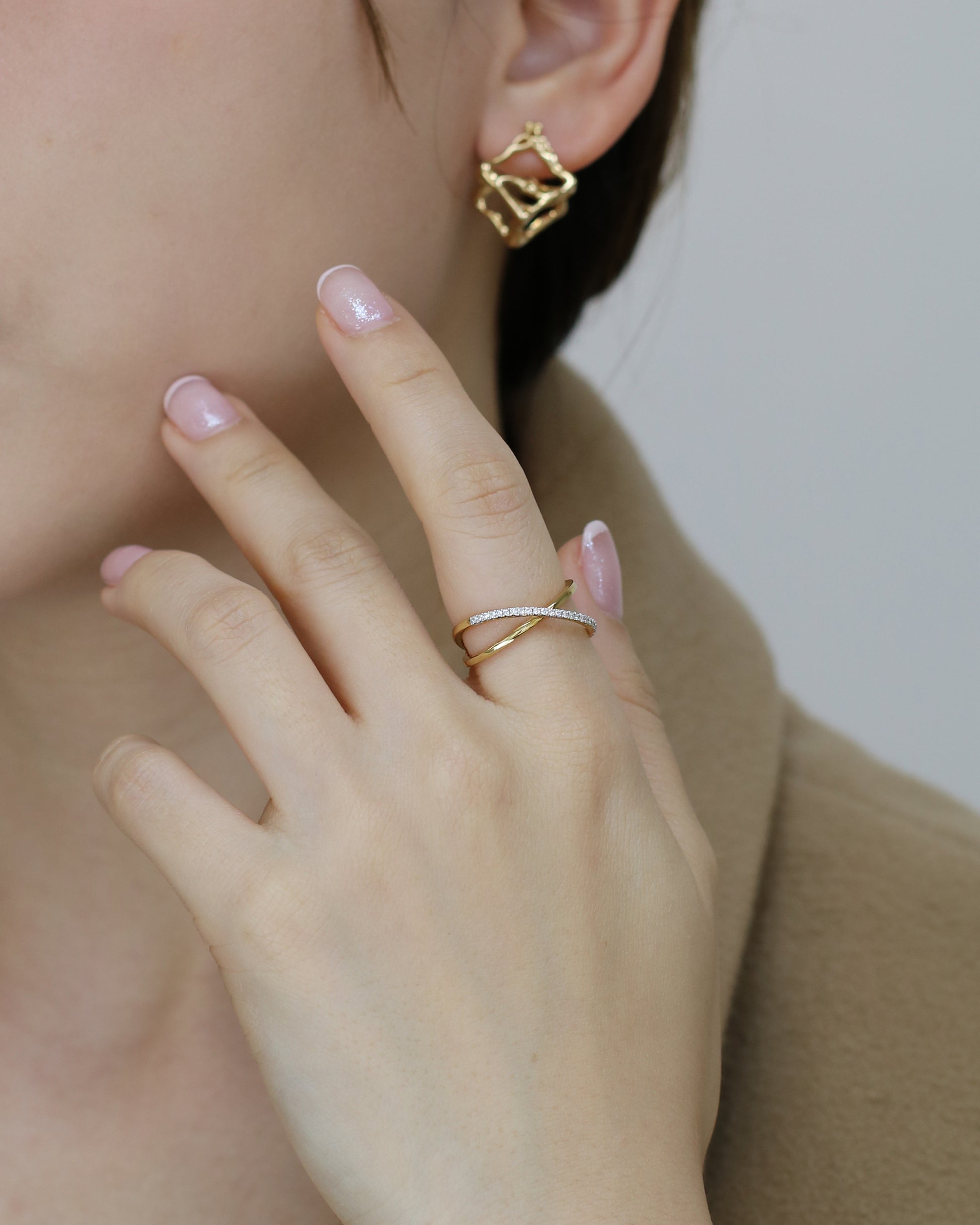 The Xenia ring brings an elegant twist with its criss-cross design sparkling with pavé-set diamonds. Its lively shimmer and unique pattern make it a stylish piece that brightens any outfit and sparks joy every time you wear it.